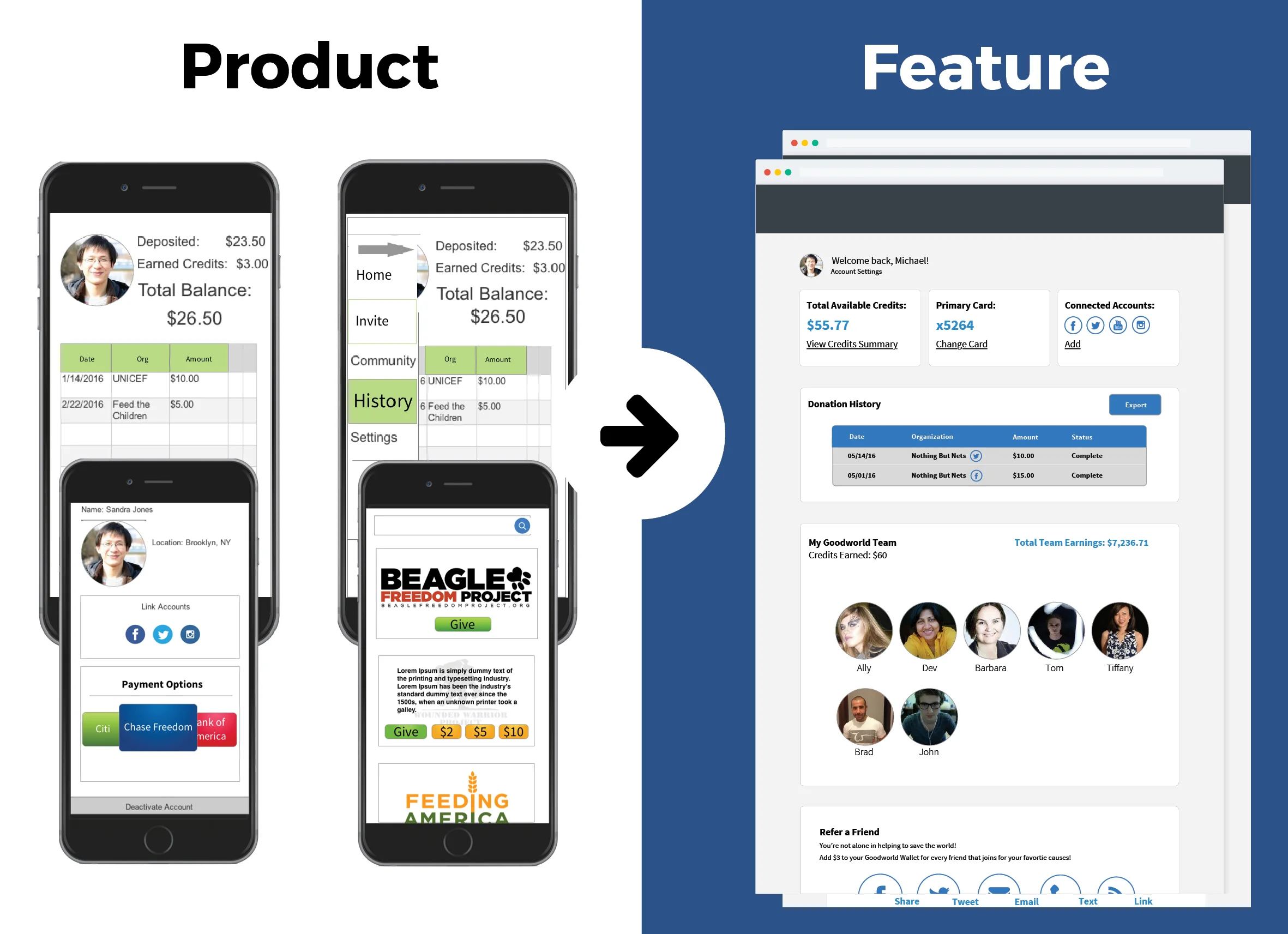An afternoon of competitive analysis yielded a big finding: GoodWorld is the only player in the social payment landscape that can bring the platform to its users. With GoodWorld’s #donate technology, anyone can make a donation without having to leave FB or Twitter, creating an experience that is easy, instant and seamless. On the contrary, Venmo (main competitor) grows its platform by tying people to its own social network - Venmo world. Since social media integration is unique to GoodWorld, and we envisioned taking it to next level by designing an integrated and unified social-giving experience.