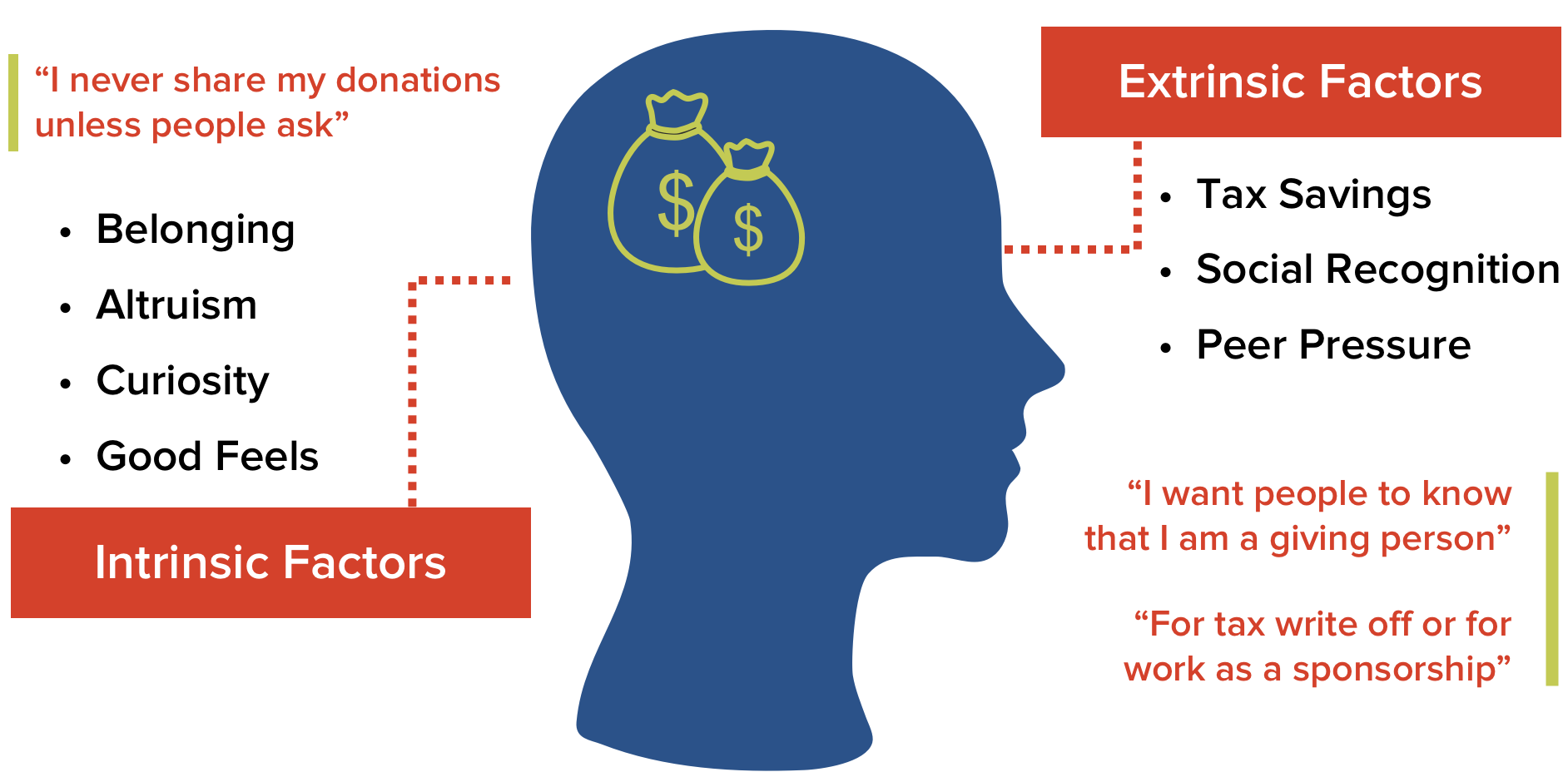The desire to donate is largely intrinsic- people don't expect to receive anything in return for their donations. However, they can be influenced by external factors such as tax savings, social recognition, and peer pressure.