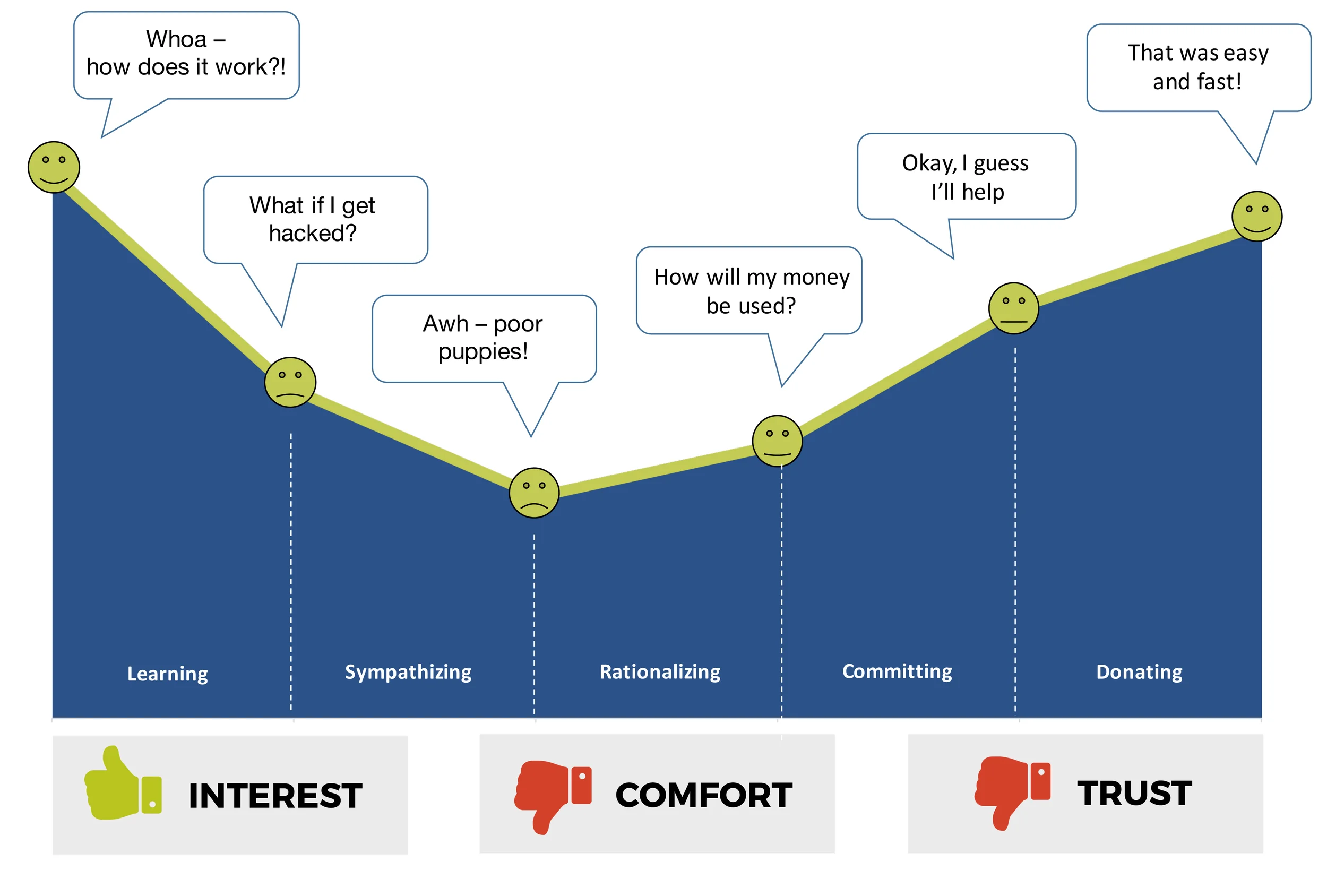When I asked people unfamiliar with the #donate technology to go through the process from start to finish, I saw that they all exhibited similar levels of discomfort, mistrust and interest across the board. The novelty of the technology piqued their interest, but at the same time, they were concerned about security. What if their Facebook or Twitter account got hacked and the hacker went on a rampage with #donate? Not to mention the intense and lingering mistrust of charities that keeps people from giving in the first place, as seen in the experience journey below.