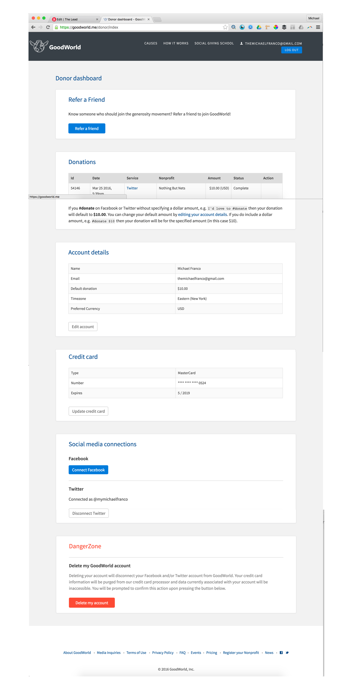In 2014 GoodWorld, Inc. revolutionized online philanthropy. For the first time, anyone can make donations to their favorite causes with a hashtag. Giving is easy as using #donate in a tweet or Facebook post. Goodbye complicated payment forms. Since its inception, GoodWorld has been creating a better world by inspiring generous deeds on social media.
