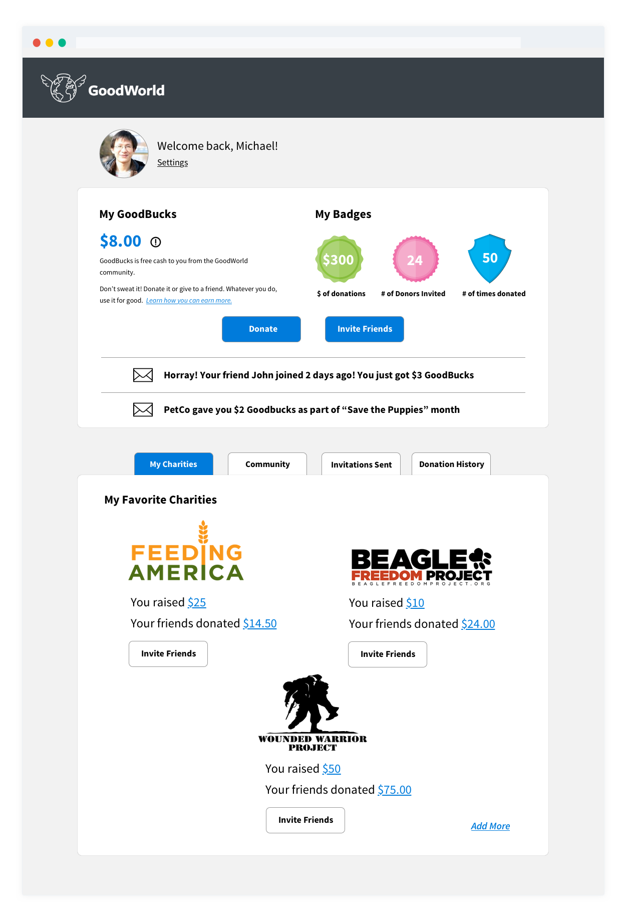 - Building fun factor: Chores are boring and are done solo. Donating is not a chore. GoodWorld donors are never alone in their journey.